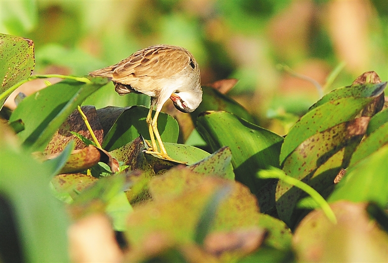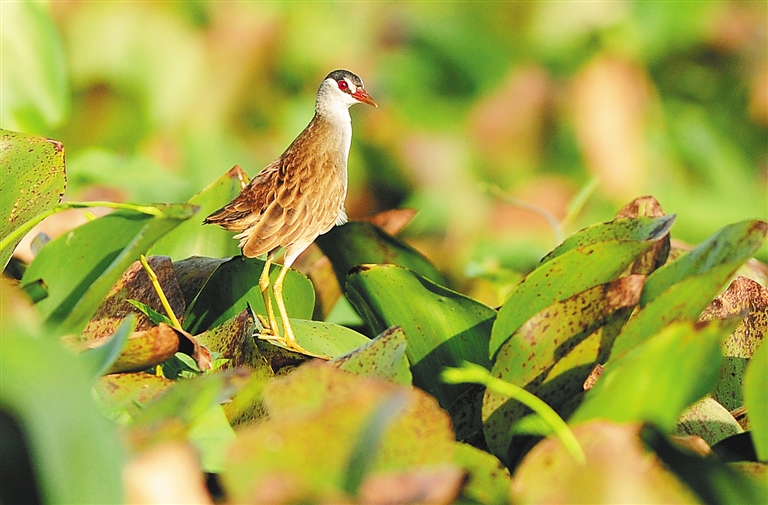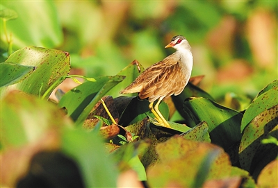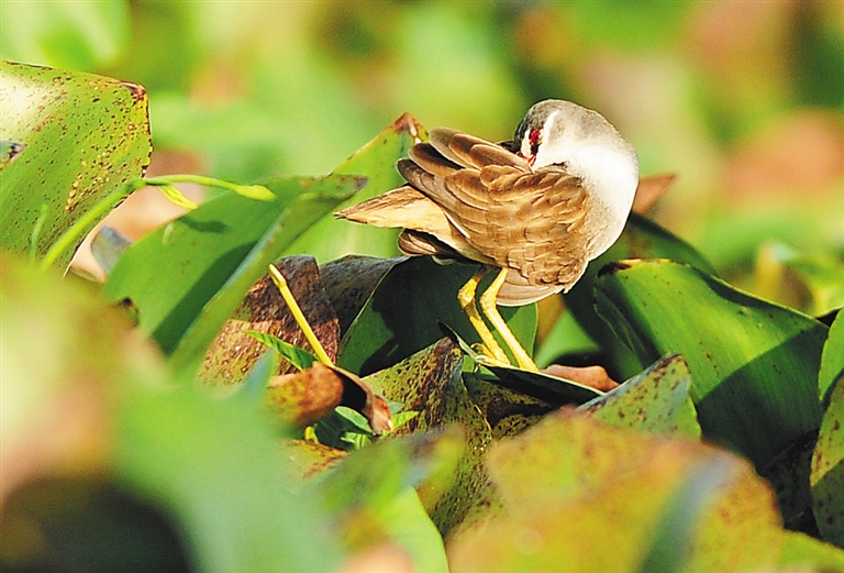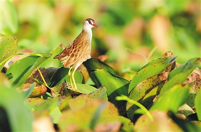 东方医院(原铁路医院)旁边的湿地(西湖湿地)是王景和拍鸟的基地之一。今年1月初,他在湿地边的小路上坐等黄苇鳽捕鱼,突然发现有只褐色的小鸟在密密实实的水葫芦里穿梭,但由于距离太远,它行动又快,没有拍到它。出乎他意料的是,1月7日上午,还在那片湿地,它竟站到了水葫芦叶上。王景和马上掉转镜头,拍了起来。由于距离较近,大约10米,“我看它白眉毛,白下颏,大眼睛,红眼圈,憨态可掬。它先是左顾右盼,看没什么危险了,便开始梳妆打扮。从9点一直呆到9点10分,才飞向别处。”
