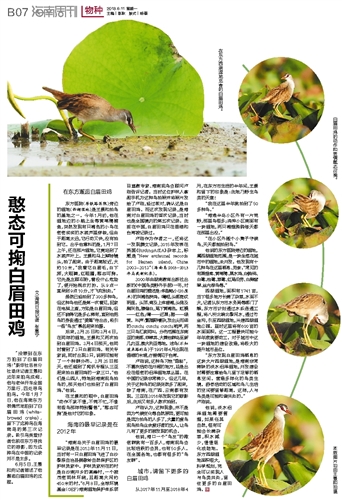 “海南岛关于白眉田鸡的最早记录是在2012年11月11日,当时有一只白眉田鸡飞进了白沙黎族自治县鹦歌岭自然保护区的护林员家中。护林员家所在的村是白沙南开乡的高峰村,一个被茂密雨林环绕,且距离大河约450米的村。”6月8日,全球环境基金(GEF)海南湿地保护体系项目宣教专家、海南观鸟会顾问卢刚告诉记者。当时这位护林人拿起手机为这种鸟拍照并将照片发给了卢刚,经过核对,确认这是白眉田鸡。而这次发现记录,是海南对白眉田鸡的首次记录,当时也是全国境内的第五次记录。此前在中国,白眉田鸡只在香港和台湾被记录过。