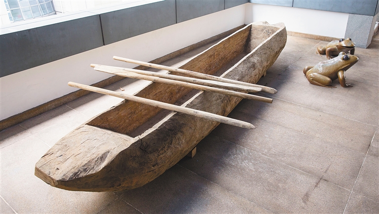 独木器具制作者陈取文向记者介绍了两种具有代表性的独木器具——多脚凳和独木舟的制作过程。