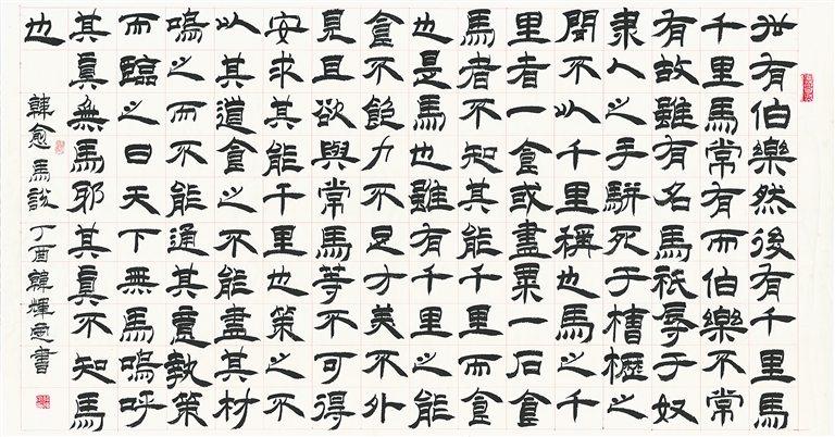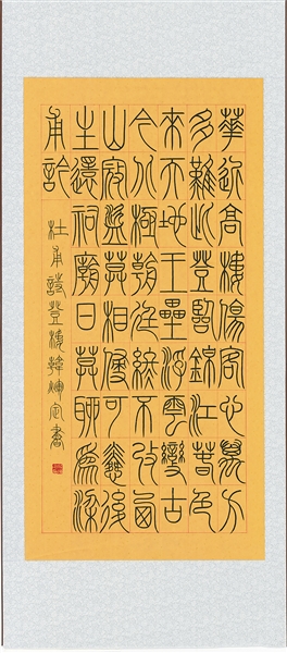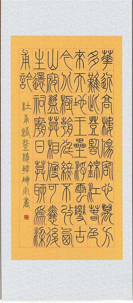 于个人喜好而言,韩辉定多年钻研篆书,在他看来,篆书是汉字的鼻祖,标准的中华汉字则是从小篆开始,而后来的隶书、楷书也都是从小篆演变而来。习字者溯汉字本源,他用了10年的十年研究篆书,并创作了50条屏、共5400多字的篆书作品《金刚经》等。但就教学而言,韩辉定又将楷书排在首位。