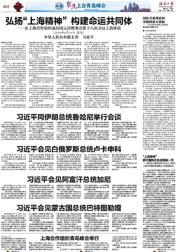 | 海南日报 聚焦上合青岛峰会 002 2018-06-111 2018年06月11日 星期一 |