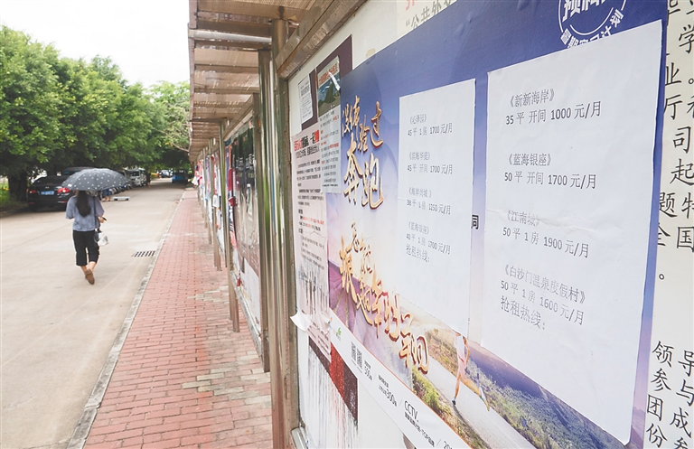 近日,记者走访海南大学附近的万福新村、拦海村发现,这些区域四处张贴着寻人同租、求租房子的广告。在万福新村一处宣传栏上,招租广告占了“半壁江山”,密密麻麻写着房东的电话号码。