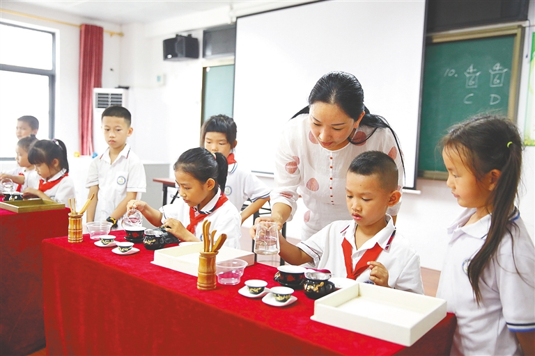 在海口市美兰区美苑小学,孩子们在茶艺师的引导下,学习手势、茶具以及泡茶等礼序。近日,美苑小学举办“茶道”兴趣班实行免费教学,旨在培养孩子们对传统茶文化的热爱。目前已经有30名学生参加。