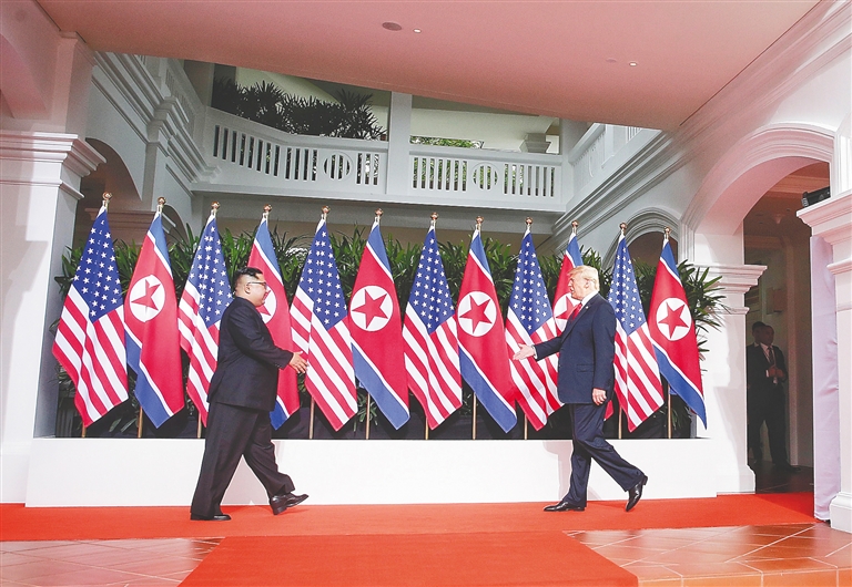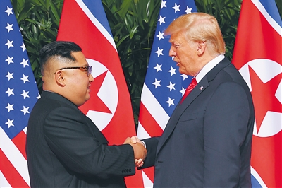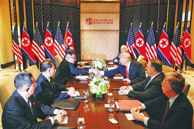 金正恩和特朗普当天在这里 举行朝美在任领导人历史上首次会晤,并签署了一份联合声明。