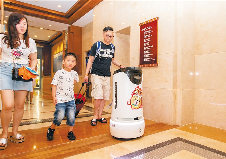 “今年初,我们与阿里巴巴合作,游客通过‘天猫精灵’或手机下单,智能机器人接单后,会自行规划路线,搭乘电梯将货品实时送到房间,既能提供方便快捷的服务,还减少人力成本。”三亚天域度假酒店亲子中心总监高晔说,该酒店对标国际水准,探索科技化手段,还将推出线上VR选房服务、还将探索“刷脸”自助入住等服务,发展浸入式消费新模式,升级酒店产品体验。