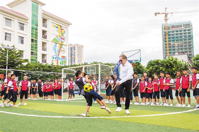 6月12日,在三亚市实验小学的操场上,AC米兰俱乐部形象大使弗朗哥·巴雷西和孩子们一起踢球。当天,中国下一代教育基金会——少儿足球发展计划“AC米兰校园足球”公益活动三亚地区活动正式启动。