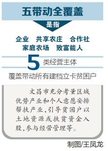 所谓“五带动全覆盖”,是指企业、共享农庄、合作社、家庭农场、致富能人5类经营主体,覆盖带动所有建档立卡贫困户。文昌市充分考量区域优势产业和个人意愿安排帮扶产业,引导贫困户以土地资源或扶贫资金入股,参与经营管理等。