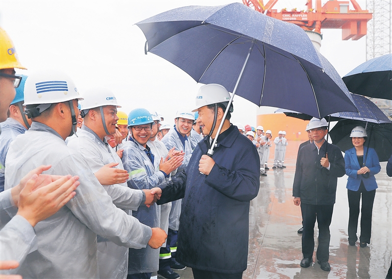 风急云低,雨流如注。13日下午,习近平来到中集来福士海洋工程有限公司烟台基地。作为国内率先进入海洋工程行业的企业,中集来福士用10年左右时间,国产化率从不足10%提高到60%。在厂区码头上,习近平撑着雨伞,趟着积水,近距离察看停靠在这里的自升式修井生活平台,远眺“蓝鲸1号”超深水双钻塔半潜式钻井平台、“泰山”龙门吊、海洋牧场平台,向企业负责人详细了解高端海洋工程设备制造、维护、运行情况。海风吹起了衣襟,雨水打湿了裤腿。习近平站在雨中,同围拢过来的工人们一一握手、亲切交谈,向作业平台上的工人们挥手致意。习近平指出,国有企业特别是中央所属国有企业,一定要加强自主创新能力,研发和掌握更多的国之重器。国有企业要深化改革创新,努力建成现代企业。要坚持党对国有企业的领导不动摇,坚持建强国有企业基层党组织不放松,为做强做优做大国有企业提供坚强组织保证。