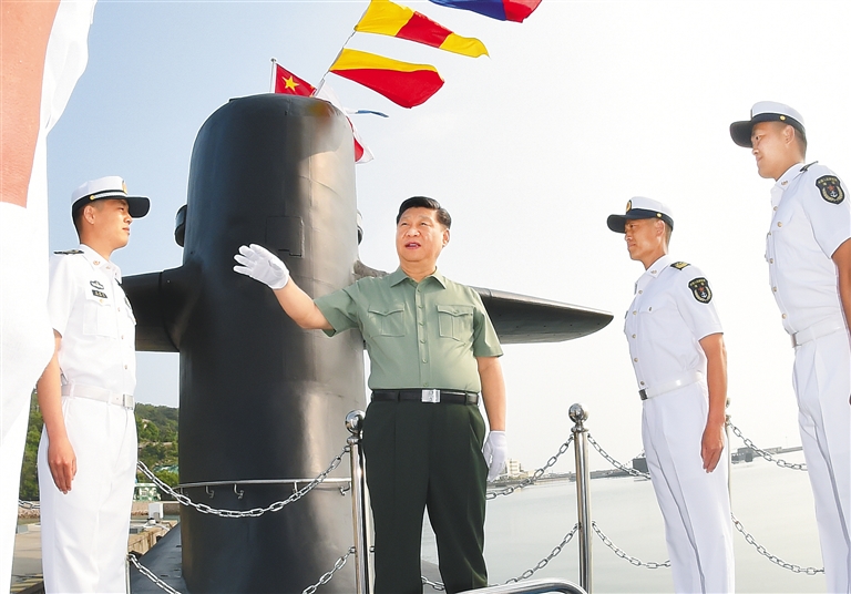 夏日的青岛,红瓦绿树,碧海清风。15时30分许,习近平来到某潜艇部队,首先听取了部队建设有关情况介绍。军港码头上,前不久参加过南海海域海上阅兵的某新型潜艇伏波静卧,满旗高悬,艇员们在艇面上分区列队,精神抖擞迎接习近平到来。习近平登上潜艇,走到艇员们中间。习近平一直牵挂着常年奋斗在深海大洋的潜艇兵们,他关切询问官兵的工作生活情况。了解到官兵们爱岗敬业、战风斗浪,圆满完成各项工作时,习近平点头赞许。习近平下舱室、进战位,详细了解武器弹药技战术性能。他勉励官兵们坚定理想信念,建设坚强集体,把打赢本领搞过硬。习近平在潜艇航泊日志上郑重签名。离开码头时,习近平特意走向停泊在附近的另一艘潜艇,向整齐站坡的官兵们挥手致意。