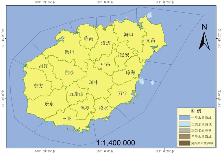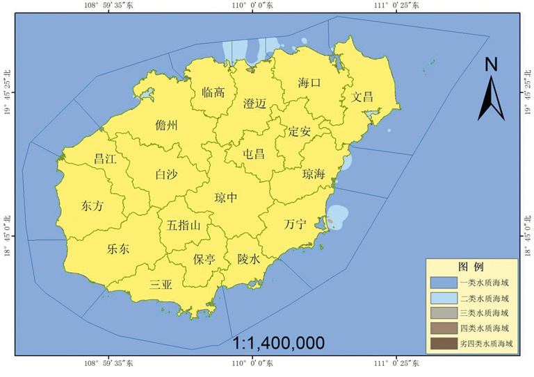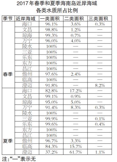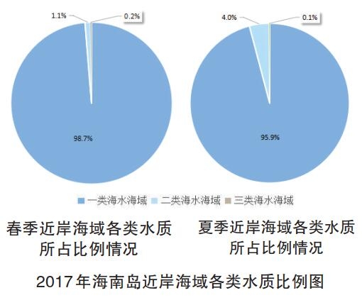 春季,海南岛周边近岸海域水质符合第一类海水水质标准的海域面积占海南岛近岸海域面积的比例为98.7%,二类海水占1.1%,三类海水占0.2%,三类海水分布在东水港附近海域,主要超标因子为石油类。
