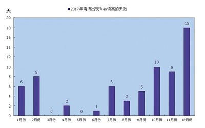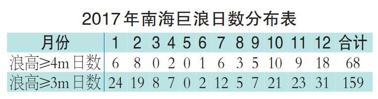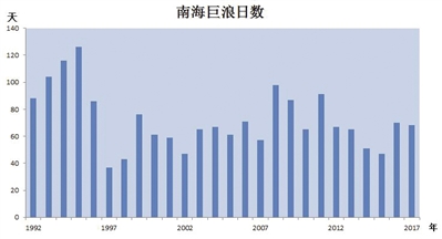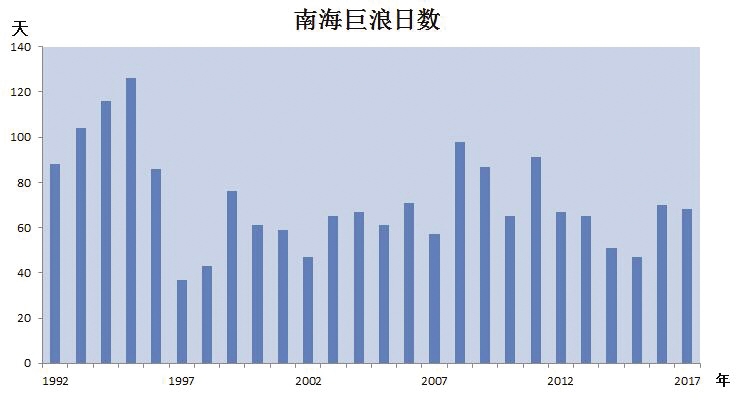 2017年度南海出现浪高大于4米的日数共有68天,与2016年相近;浪高大于3米的日数共159天,较2016年明显增多。2017年因热带气旋(热带风暴及以上级别,下同)影响产生的巨浪日数29天,因冷空气影响产生的巨浪日数44天,冷空气与热带气旋共同影响产生的巨浪日数5天。与2016年相比,2017年因热带气旋和冷空气产生的巨浪日数均相近。