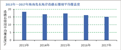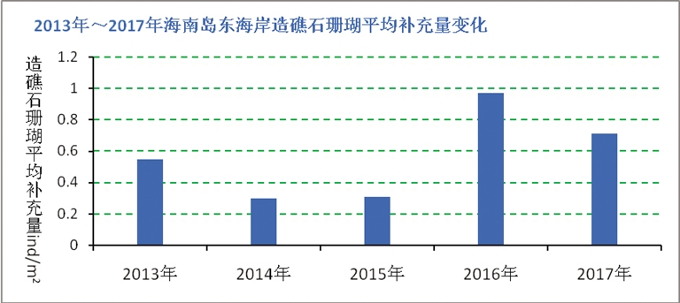 2013年~2017年海南岛东海岸造礁石珊瑚平均覆盖度趋于平稳,2017年较上一年略有下降,造礁石珊瑚平均补充量有回升的趋势。