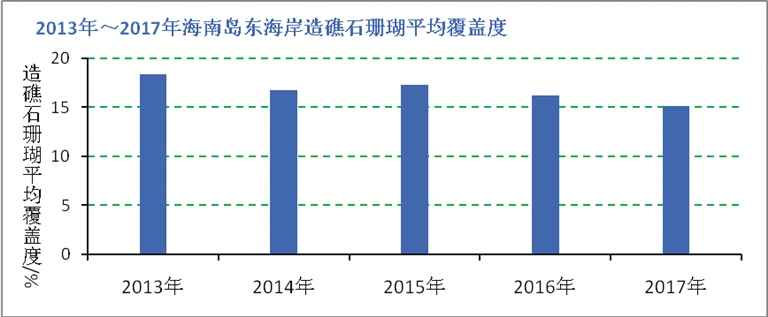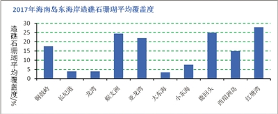 珊瑚礁生态状况 2017年,对海南岛东海岸的铜鼓岭、长圮港、龙湾、蜈支洲、亚龙湾、大东海、小东海、鹿回头、西岛、红塘湾等10个珊瑚礁海域进行了珊瑚礁生态系统的监测。