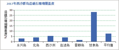 珊瑚礁生态状况 2017年,对三沙市西沙群岛的永兴岛、西沙洲、赵述岛、北岛、晋卿岛、甘泉岛等6个海域进行了珊瑚礁生态系统的监测。