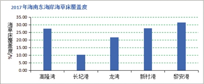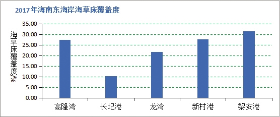 海草床生态状况 2017年,对海南岛东海岸的高隆湾、长圮港、龙湾、新村港及黎安港等5个海域进行了海草床生态系统的监测。