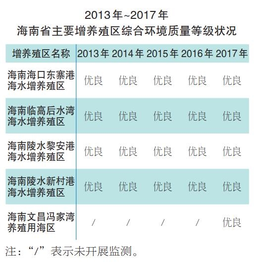 2017年,我省对海口东寨港、临高后水湾、陵水黎安港、陵水新村港4个增养殖区和文昌冯家湾养殖用海区开展了环境质量综合监测。结果显示,实施监测的4个海水增养殖区和1个养殖用海区的环境质量均满足养殖功能要求,综合环境质量等级为优良。