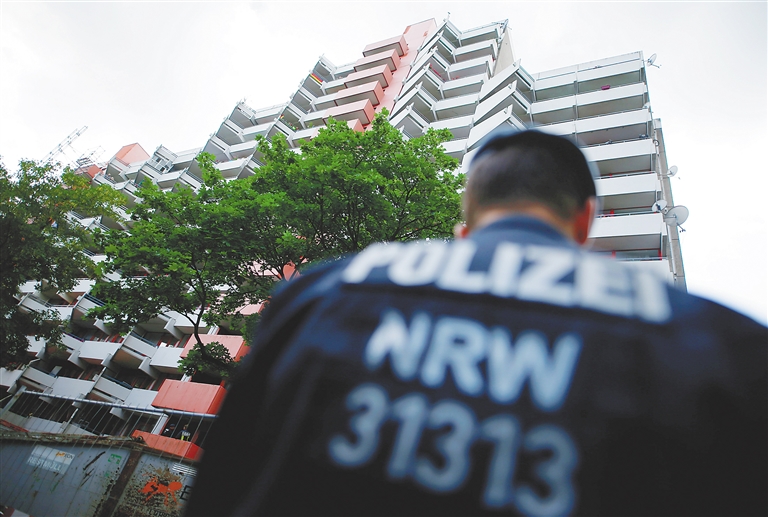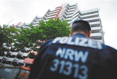 6月15日,在德国科隆,警察在嫌疑人居住的公寓楼外警戒。