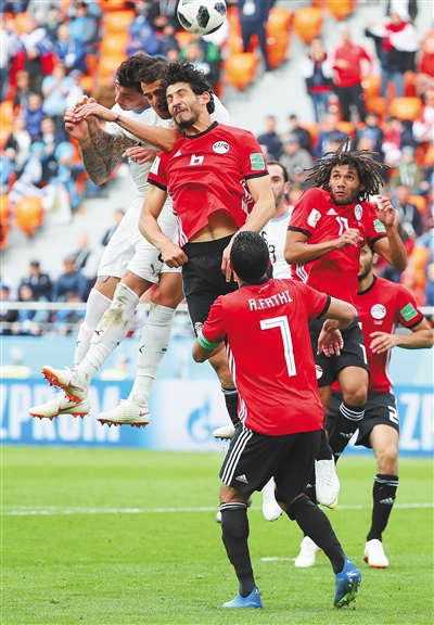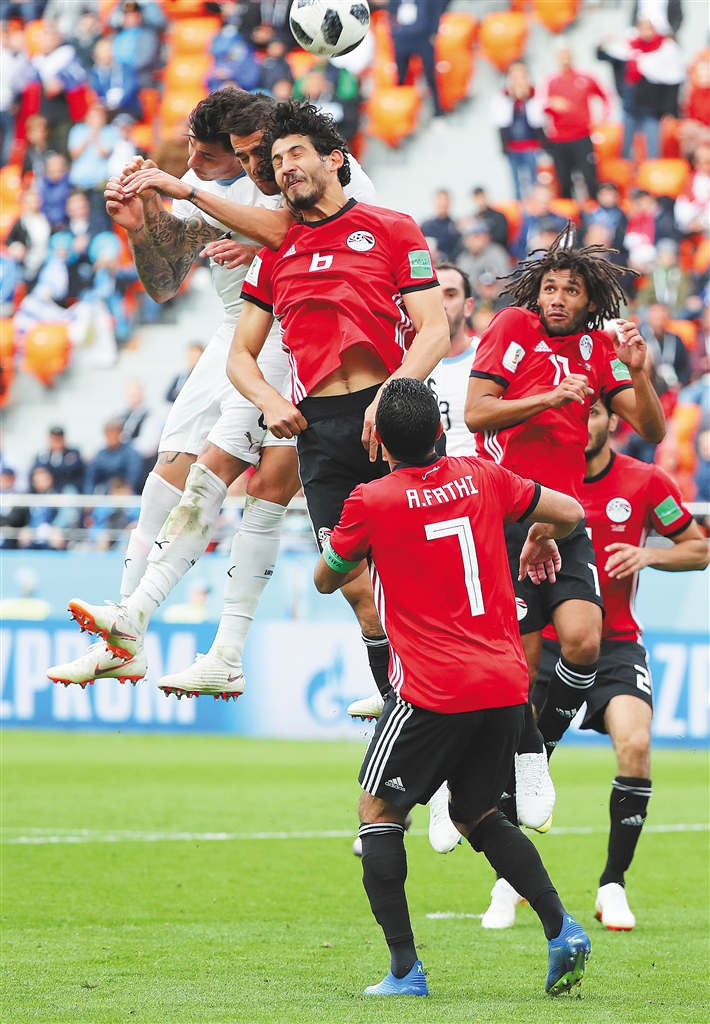 十五日,埃及队球员赫加齐(左三)在比赛中争顶头球。新华社发