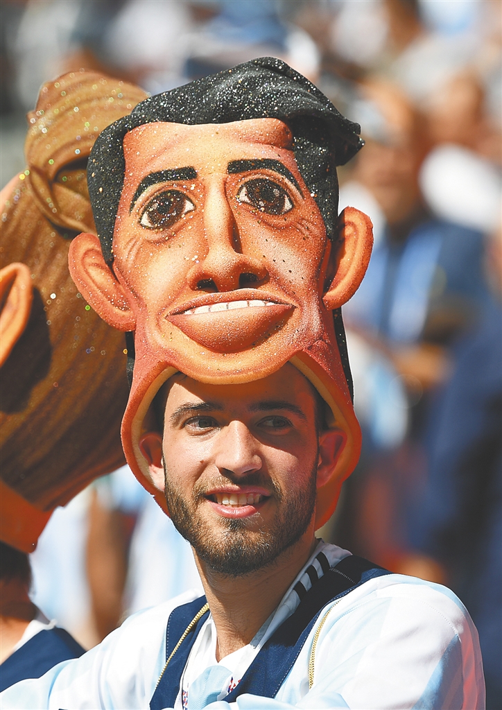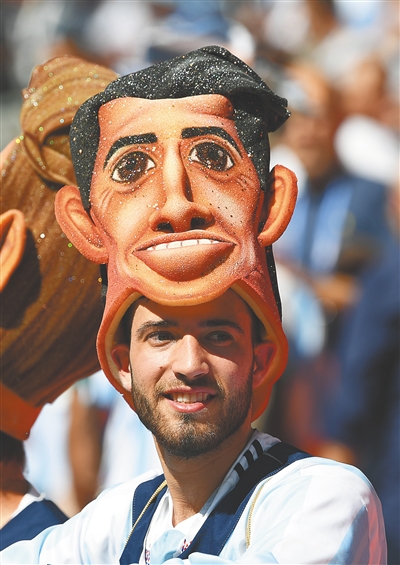 6月16日,一名阿根廷队球迷在阿根廷队对阵冰岛队比赛前为球队助威。 新华社发