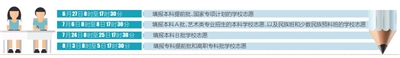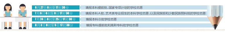 其中,6月27日8时至17时30分,填报本科提前批、国家专项计划的学校志愿(含需面试的部分专科学校,不含在本科提前批艺术类专业的本科学校);7月6日8时至8日17时30分,填报本科A批(含特殊类型招生、地方专项计划和本省本科院校与高职院校联合办学的本科专业)、艺术类专业招生的本科学校志愿,以及民族班和少数民族预科班(含边防军人子女预科班)的学校志愿;7月24日8时至25日17时30分,填报本科B批学校志愿;8月3日8时至5日17时30分,填报专科提前批和高职专科批学校志愿。