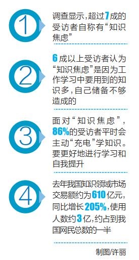 何为“知识焦虑”?就是人们对新知识、新信息和新认知迭代始终有一种匮乏感,担心自己因知识匮乏落后于社会和他人而产生的一种心理恐惧。今年,中国青年报社社会调查中心联合问卷网,对2003名受访者进行的一项调查(以下简称调查)显示,超过七成的受访者自称有“知识焦虑”。