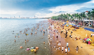 6月18日,在海口市西海岸假日海滩,虽然下午的一场大雨影响了出行,但依然有不少市民在傍晚赶来这里洗龙水过端午。