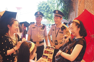 6月17日,在三亚千古情景区,旅游警察为游客耐心答疑解惑。本报记者 袁琛 摄