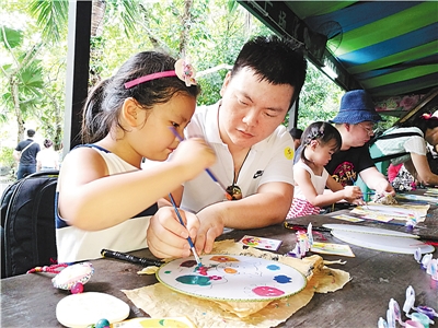 6月17日,父亲节当天,海南呀诺达雨林文化旅游区举办父亲节系列活动,“亲子DIY手绘宫扇”吸引了许多家庭踊跃参加。一把宫扇,一支画笔,小朋友一边涂画一边与爸爸互动,在爸爸们的引导和鼓励下,完成了一幅幅独特的手绘作品。本报记者 武威 通讯员 曹传佳 摄