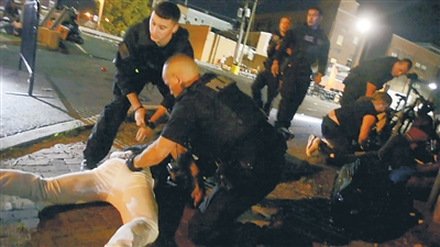 这张网络视频截图显示,6月17日,在美国新泽西特伦顿,警察在艺术节活动枪击事件现场控制一名男子。