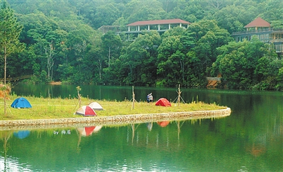 屯昌木色湖风景区的帐篷宿营区就在枫木鹿场边上的一块棕榈林地上。该地坡度平缓,并且种满高大的棕榈树,林荫密布,非常适合搭建帐篷。