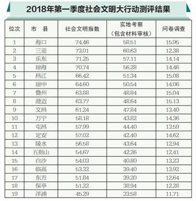 第三方专业测评机构认为,从2018年第一季度社会文明大行动测评整体情况来看,全省各地通过广泛开展社会文明大行动,公民文明素质和社会文明程度逐步得到提升,但社会文明总体水平离中国(海南)自由贸易试验区和中国特色自由贸易港的社会文明期待,离社会文明大行动的标准要求还有很大距离,还存在一些比较突出的问题。