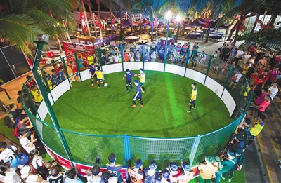 这项极具观赏性的足球比赛,吸引了不少市民、游客驻足观看,现场气氛热烈,各队纷纷亮出精湛绝活,引发球迷阵阵呐喊。除了热血激情的笼式足球比赛,现场还有“大东海世界杯足球主题乐园”游戏挑战、1VS1迷你笼式斗牛、贝式射门、勺子射门、足球投篮、足球金字塔、愤怒的足球、足球大斜面等挑战性强的游戏项目。