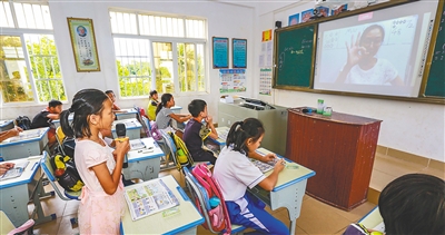6月21日,海口市龙泉镇翰香小学四年级课堂上,省乡村教育发展促进会组织志愿者通过“智慧课堂”远程互动平台给学生们上英语课。为了解决乡村小学优质师资稀缺等问题,省乡村教育发展促进会通过“智慧课堂”远程互通平台进行教学,让更多乡村学校的孩子分享优质教学资源。本报记者 陈元才 摄