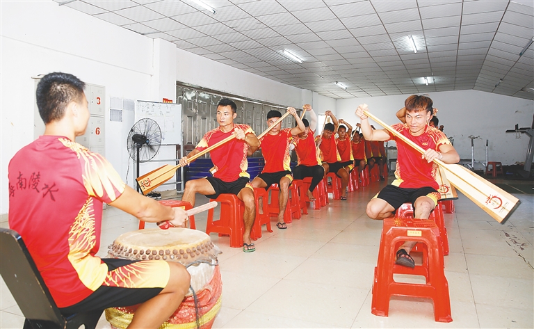 “咚咚咚……”6月20日下午,在位于陵水黎族自治县海航体育广场的一间训练室内,伴随着一阵阵节奏强烈的击鼓声,陵水龙舟队队员正在紧张地训练。