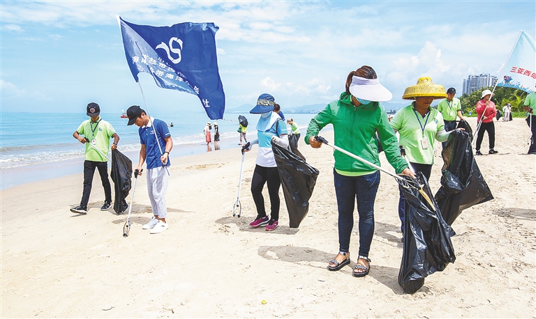 当天,身着绿色、蓝色马甲的志愿者顶着骄阳,分赴三亚湾沿岸各站点开展清洁沙滩、为旅客提供咨询服务、对不文明的旅游行为进行劝阻等活动,以实际行动展示三亚文明精神风貌,共促社会和谐文明。