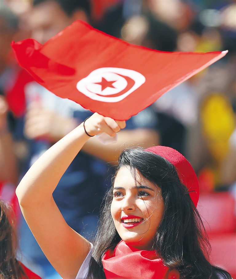 6月23日,在比利时与突尼斯的比赛中,突尼斯女球迷在看台上为球队加油助威。新华社发