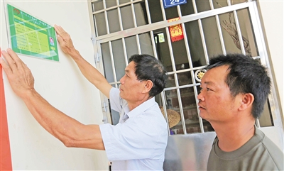 6月23日,在琼中黎族苗族自治县红毛镇金屏村,扶贫工作人员在农户家门口贴农村常住人口精准管理公示牌。为做好农村常住人口精准管理,琼中对一般农户、贫困户、已脱贫户、特困户、残疾户、低保户等进行分类挂牌,公示牌内容包括家庭人口、经济来源、历年收入、“三保障”情况,确保信息公开、公平、公正。 本报记者 陈元才 通讯员 朱德权 秦海灵 摄