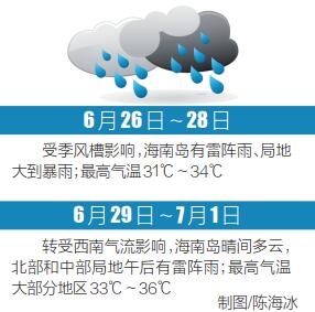 本报海口6月25日讯 (记者叶媛媛 通讯员王天巍 翁小芳)记者今天从海南省气象台获悉,本周前期受季风槽影响,海南岛多雷阵雨天气;后期转受西南气流影响以晴间多云天气为主,气温将升高。预计7月可能有1~2个热带气旋影响海南岛。