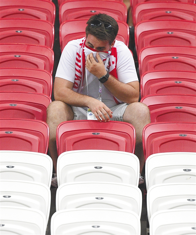 25日,一名波兰队球迷在波哥之战后情绪低落。 新华社发