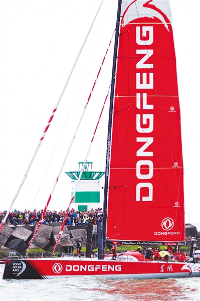 6月24日,代表中国参加2017-2018赛季沃尔沃环球帆船赛的东风队率先冲过位于荷兰海牙的终点线,在还剩一场港内赛的情况下提前锁定总冠军,并成该赛史上首支获总冠军的中国船队。图为东风队船员向岸边观众挥手致意。 新华社发