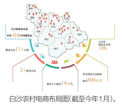 从创建全省第一个县级电商精准扶贫运营中心,到全县建成50个农村电商服务站,覆盖全县11个乡镇和2个农场,22个建档立卡贫困村,到从事电商的贫困户人均增收约1400元,90多种特色农产品触网直销,白沙仅花了1年零3个月时间。