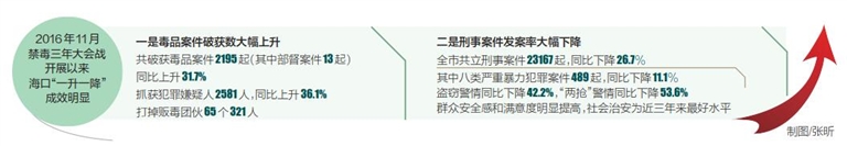 海口禁毒三年大会战取得显著成效,进一步树立了党委政府形象,极大鼓舞了士气,坚定了各参战单位的担当意识和责任意识。今年初,海口市也被国家禁毒委员会办公室确定为第一批全国禁毒示范城市创建单位。