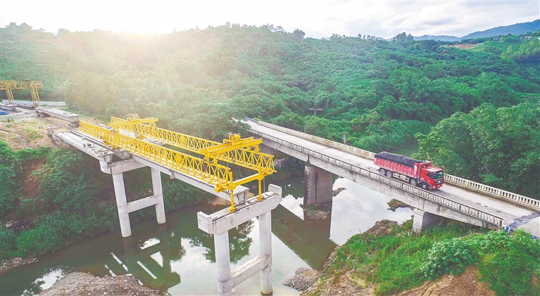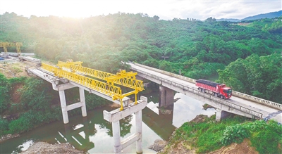 6月26日,在琼中黎族苗族自治县红毛镇境内的南阶桥改建工程顺利推进,开始架设箱梁。《海南省交通基础设施扶贫攻坚战农村公路建设工程实施方案》提出,到2018年,全面消灭农村公路现有危桥,解决农村公路安全防护问题。本报记者 陈元才 通讯员 朱德权 秦海灵 摄