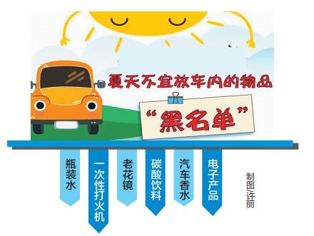 在阳光暴晒的车内存放一段时间以后,饮用水塑料瓶易挥发出对人体有害的物质,若继续饮用,将造成安全隐患。含有二氧化碳气体的碳酸饮料,在高温下容易膨胀,进而引起爆裂,发生危险。此外,汽车香水挥发产生易燃气体,爆炸临界点为49℃,而夏天阳光照射15分钟,车内温度会达到65℃,很容易引发爆炸。
