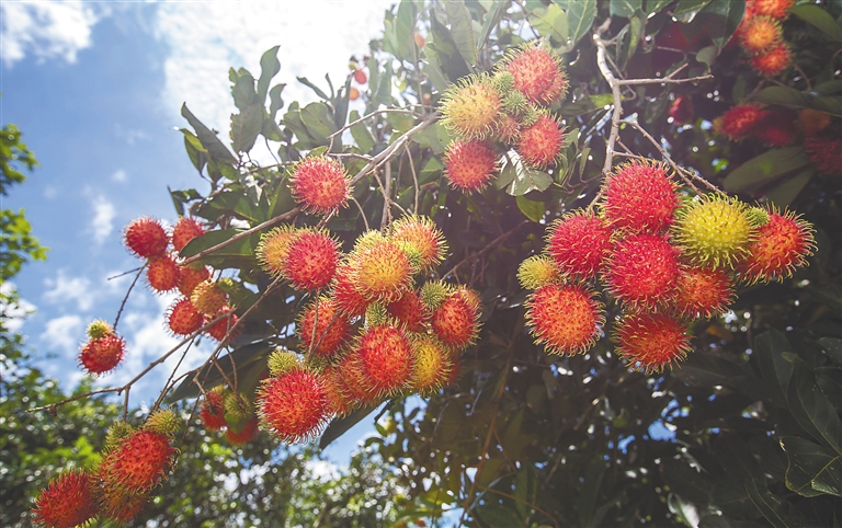 其实海南本土也有野生的红毛丹,保亭、昌江、澄迈等县的山区都有分布,但是现在市面上销售的都是保亭热作所上世纪60年代从马来群岛引种的,目前成为保亭的特有水果。这种水果表皮有软刺,形状像小刺猬,一般在6~7月挂果,10~12月成熟。