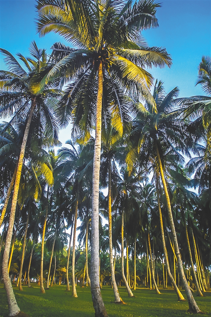 椰子,树如槟榔,状如棕榈,叶如凤尾,高十数丈。琼州有民谣“不买椰衣只买心”的说法,挑选椰子,要用手摇晃听其中的声音,水声清亮则心甜肉厚;水声浑浊则相反。文昌享有“文昌椰子半海南”的称誉。椰子的种植遍布全岛,王佐在《椰园写景二首》中把椰汁比喻成九天仙子送来的琼浆,把椰壳比作盛酒的容器——云纹的周罍和陶制的秦缶,伸展入云端的椰叶则如高入苍穹的军旗。“遮莫中原多沃壤,只知琼岛是生乡。”任凭中原多么肥沃的土壤,椰子只知道琼州是它生长的故乡!在《和李司训<看破椰子>》诗中他惊讶椰子的华贵:玉碗盛来的椰汁似甘露,金刀砍削的椰肉如软银,琼岛灵秀土地孕育的椰芽若玉笋!