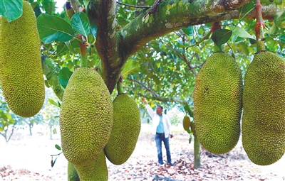 海南土产的甜美甘香的热带水果除了芭蕉、菠萝,芒果、山竹子、黄皮、橘、柑等等之外,还有种甜腻的庞然大物:菠萝蜜。菠萝蜜在盛夏成熟,单个果实重达三四十斤,皮厚有软刺,气味芬郁。果仁炒熟后能补中益气,清代屈大均的《广东新语》称:“天下果之大而美者,惟此与椰子而已。”它剖之若蜜,其香满室,据说产自临高的最好。