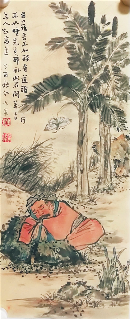 一幅《周公梦蝶》,朱砂晕染出一位醉态朦胧老翁,满面红光,怡然自得地伏在山野石头上呼呼大睡,那豪放不羁的酒态,颇有点返璞归真的味道。