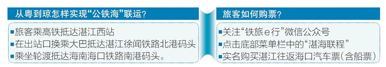 今天,广铁集团推出公铁海联运,即高铁+汽车+轮船三种方式的客运联运,这在我国尚属首例。旅客在湛江西站出站口,便可换乘大巴抵达湛江徐闻铁路北港码头,然后乘坐轮渡(设有旅客专属优先通道)至海南海口铁路南港码头。旅客可直接关注“铁旅e行”微信公众号,点击菜单栏中的“湛海联程”,实名购买湛江往返海口汽车票(含船票)。