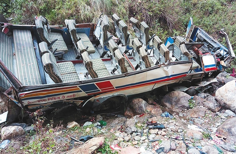 这是7月1日在阿肯德邦拍摄的客车坠落现场。据印度媒体报道,一辆客车1日上午在印度北部坠落山谷,造成至少35人死亡。新华社/法新